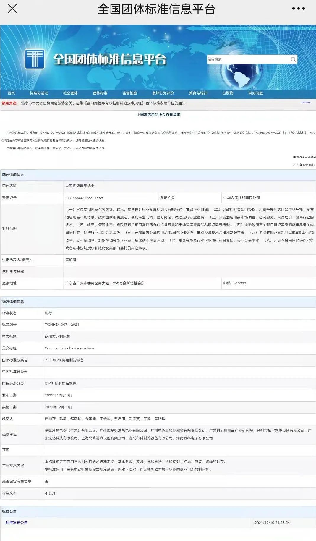 星极在不断创新发展的同时,也希望带领中国制冰行业逐步走上规范化、标准化、精细化的道路。据了解,在2021年,星极联合广州中酒厨检测服务公司、广东省酒店用品产业研究院及近十家制冷设备公司,联合起草制定了《商用方冰制冰机团体标准》和《商用月牙冰制冰机团体标准》,可以切实满足制造商对产品的质量品控要求,引导商用制冰机企业进一步关注方冰制冰机、月牙冰制冰机产品质量,有助于加强行业自律监管,推动行业规范健康发展,同时提升我国商用制冰机行业国际竞争力及影响力。