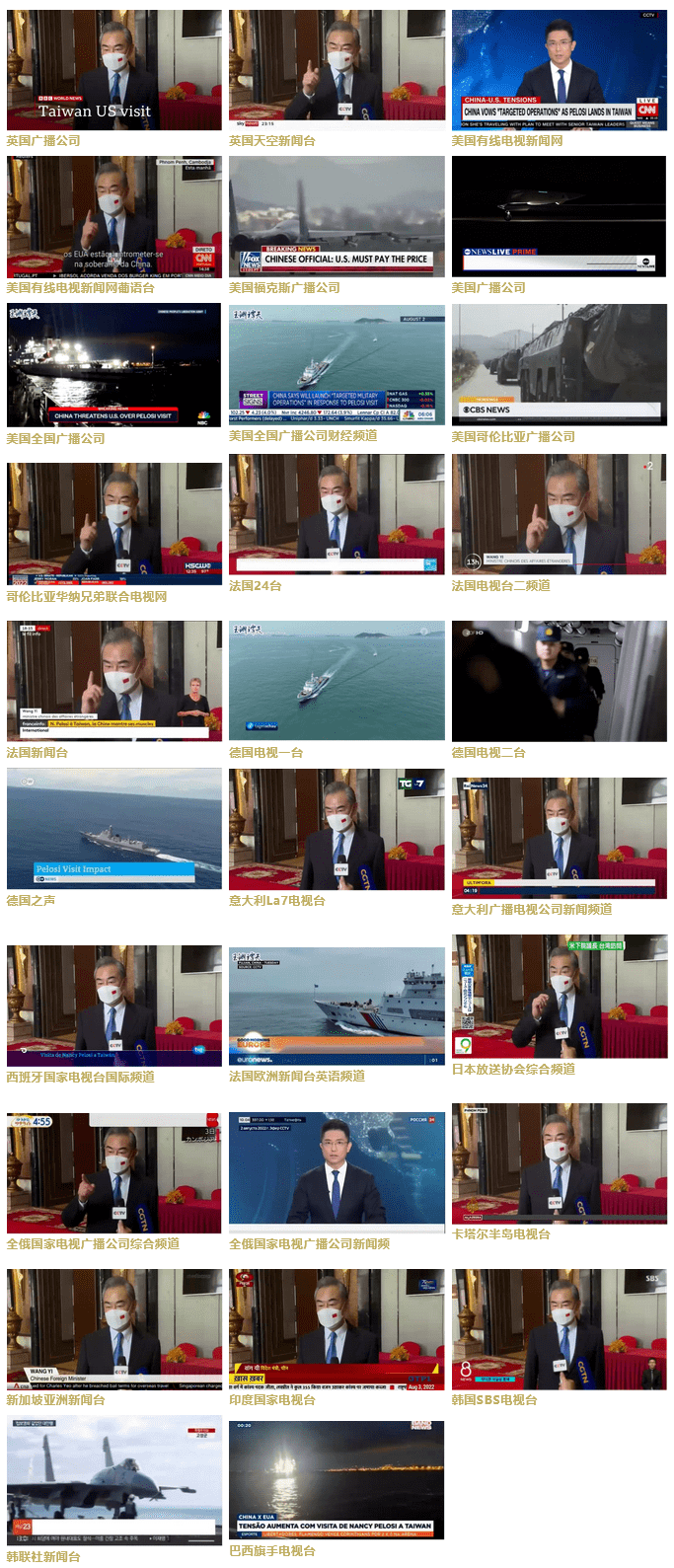 总台国际视频通讯社聚焦外交部、国台办、东部战区等权威表态,可视化制作编发《国际锐评》《玉渊谭天》等相关评论言论。截至8月4日10时,共有84条新闻素材得到BBC、CNN、CNBC、英国天空新闻台、法国24台、法国电视台、法国新闻台、德国电视一台、德国电视二台、德国之声、意大利广播电视公司、意大利TGCOM24电视台、加拿大广播公司、加拿大最大的商业电视网CTV、俄罗斯第一频道、全俄国家电视广播公司、日本NHK、韩国KBS、巴西环球电视台、印度国家电视台、新加坡亚洲新闻台、澳大利亚广播公司、卡塔尔半岛电视台、墨西哥阿兹特克电视台、印尼国家广播电视台等102个国家和地区的1683个电视台及新媒体平台采用。