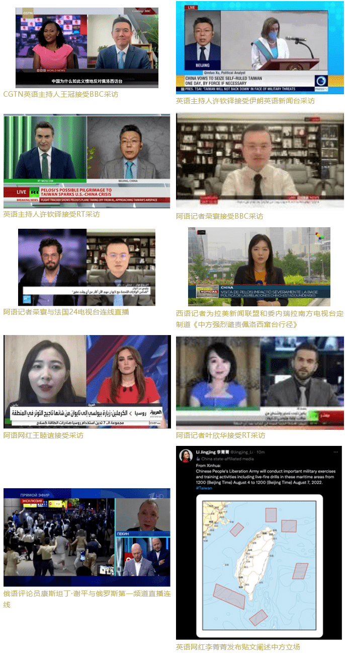 总台多语种主持人、评论员和网红积极走向全球多个主流媒体的台前,通过视频连线、撰写稿件、接受采访、参与节目以及在海外社交平台发声等形式,强调中国立场,阐释中国采取相关反制措施的合理性和必要性,揭批佩洛西等美政客的虚伪嘴脸,向国际舆论场发出有理有节、有力有效的中国声音。