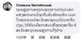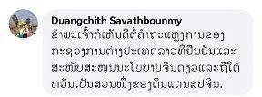 老挝新闻文化旅游部前副部长扎伦·瓦林塔萨(Chaleune Warinthrasak)留言:“老挝外交部的声明及时而严正,任何时候我们只支持一个中国原则,台湾是中国不可分割的一部分。”