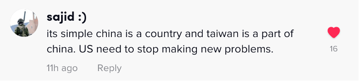 网友sajid:“真相很简单,台湾是中国的一部分,美国须停止给世界带来新的麻烦。”