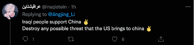 伊拉克网友@iraqistein:“伊拉克人民支持中国,粉碎一切美国可能给中国带来的威胁吧。”