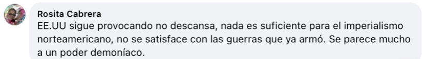 乌拉圭网友Rosita Cabrera:“美国一直在挑衅,不眠不休,对美帝国主义来说什么都不够,它不满足于已经发动的那些战争,它就是邪恶势力。”