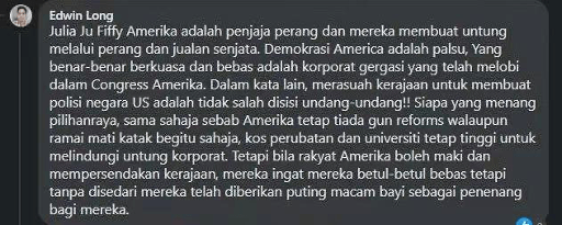 马来西亚网友Edwin Long留言:“美国就是战争贩子,他们通过战争和贩卖武器获利。美国的民主只是假象,真正享有权力和自由的是在幕后主导国会的大企业。换句话说,官商勾结在美国的法律上是被允许的!无论谁赢得选举,一样不会禁枪,医疗和教育成本还是不会下降,因为要维护大企业的利益。但是他们的人民觉得他们能骂政府就是自由的,全然没有意识到这不过是安抚奶嘴罢了。”