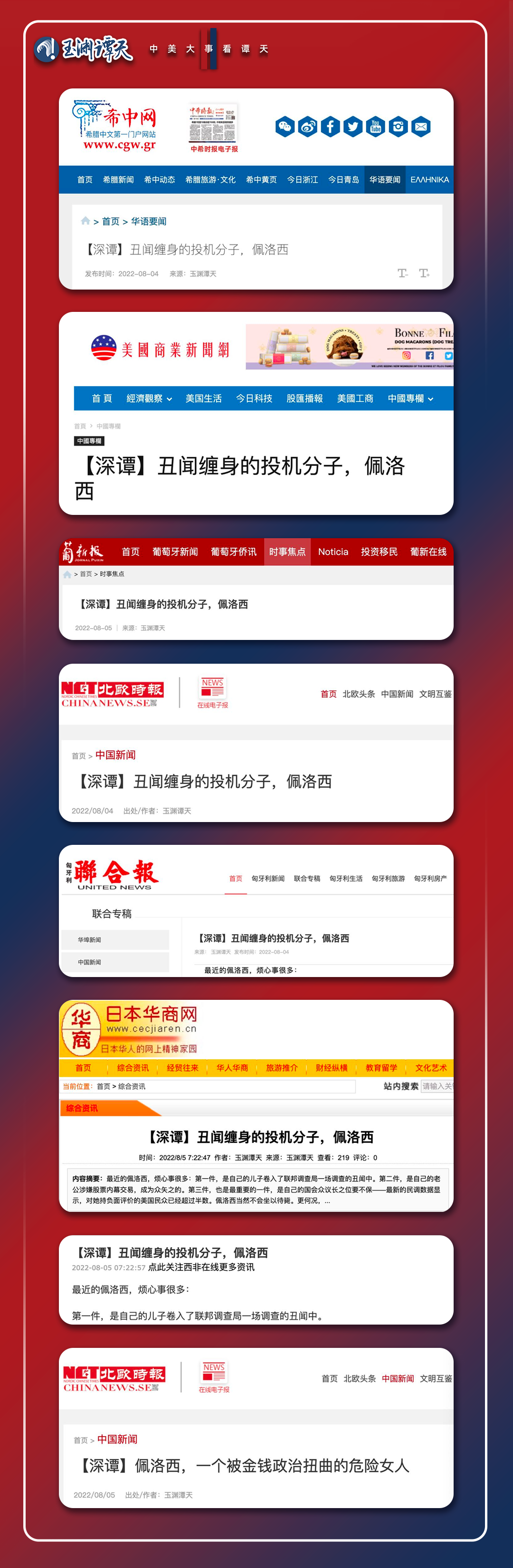 深度“三连发”!从不同侧面详尽透视佩洛西窜台行径的真实动机,痛批其将个人私利凌驾于国家利益和世界和平之上的丑恶嘴脸。