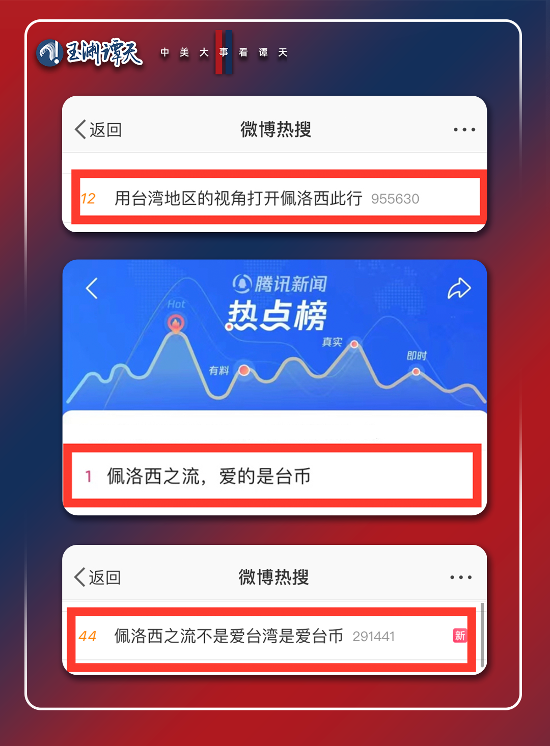 【深谭】报道全网总触达量近5亿次,报道设置的“丑闻缠身的投机分子”这一标签深入人心,多家国内外主流媒体以此为角度进行再创作。“投机分子”等词,成为知乎、今日头条、抖音、百度等平台用户,在佩洛西相关报道下的评论热词。