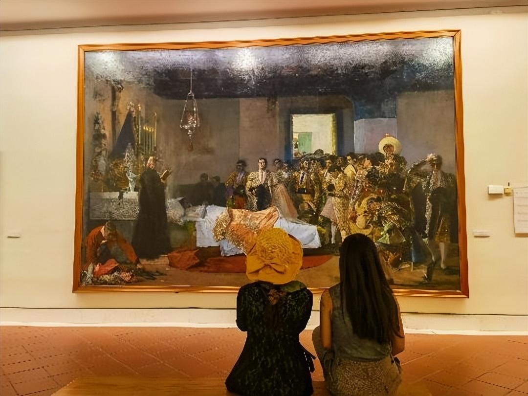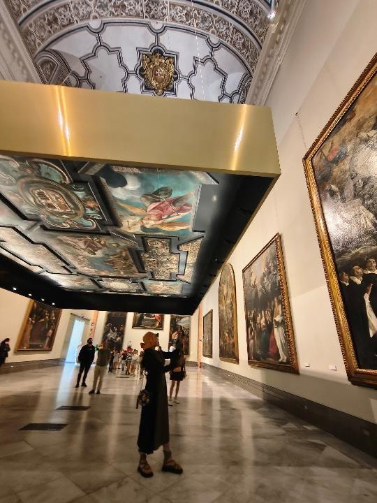 其后徐嘉敏来到了有着“西班牙艺术之乡”之称的塞维利亚,塞维利亚是委拉斯凯兹的故乡,在这个风景如画的城市,几百年前的古老教堂建筑也好似迎接着他们的到来。此行徐嘉敏的目的是参观塞维利亚省立美术博物馆,其馆藏众多,其中颇多珍品与极品。就徐嘉敏本人评价,这是对她来说很重要,很有收获的一站,塞维利亚博物馆馆藏丰富多彩,让他们一行沉浸在艺术海洋里。馆藏的许多巨幅油画,如表现神父为西班牙斗牛士祈祷的名作,和五月春会灵动的美女作品等,初见时就让她眼前一亮。这些作品极具视觉冲击力,而细细品味之后,不只是视觉上的感受,在思想上,精神上,有着动人心弦,触动灵魂的力量。其中,一副神父为逝去斗牛士祈祷的作品让她久久不能忘怀,乃至于让她呆坐了许久,沉浸其中:环境中的人物的悲伤情绪被渲染的淋漓尽致,丝绸织物和珠宝金属质感的碰撞都在画家笔下表现的十分真实,也由此可见不只是卓越的技巧所呈现的画面表现力,画家作品所传递的动人情绪也令人深感震撼。徐嘉敏还表示,这是第一次古典绘画在色彩和笔触上让她在内心找到共鸣和突破,提升了对于油画艺术的理解,对于创作和构思提升了极大的想象空间。