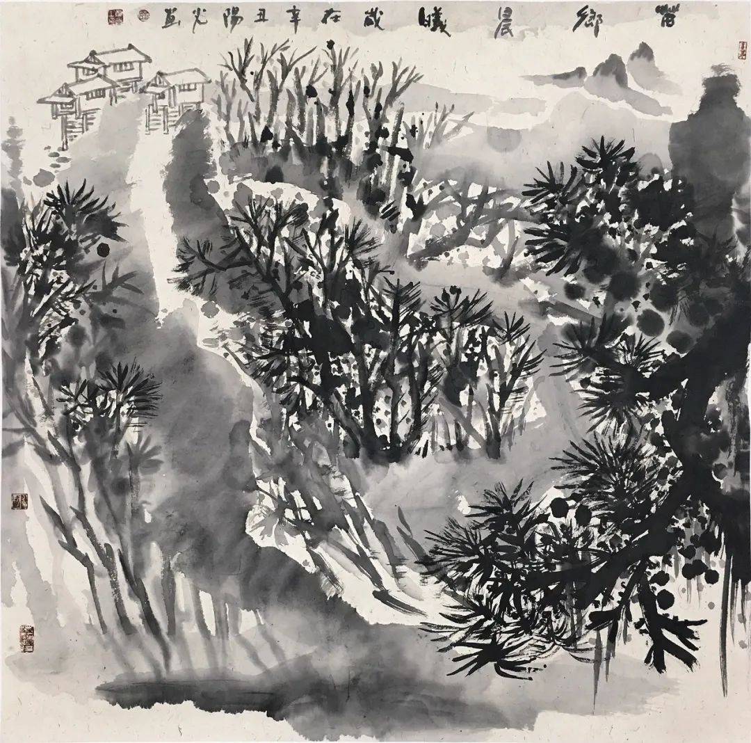韩愈有诗“江作青罗带,山如碧玉簪”,写下了桂林翠绿的山色和浮云迷离的境界,阳光所作山水,亦力寻此境。他画晨雾、晚风、晓月中的桂林山水,在情境中涵咏画境;他表现幽寂、微茫、泣露中的桂林——阳光的山水画作品,犹如用点线面组成的交响乐,有着旋律与节奏感:山在动、水在动,林木飒飒、空气流通,意象分明。