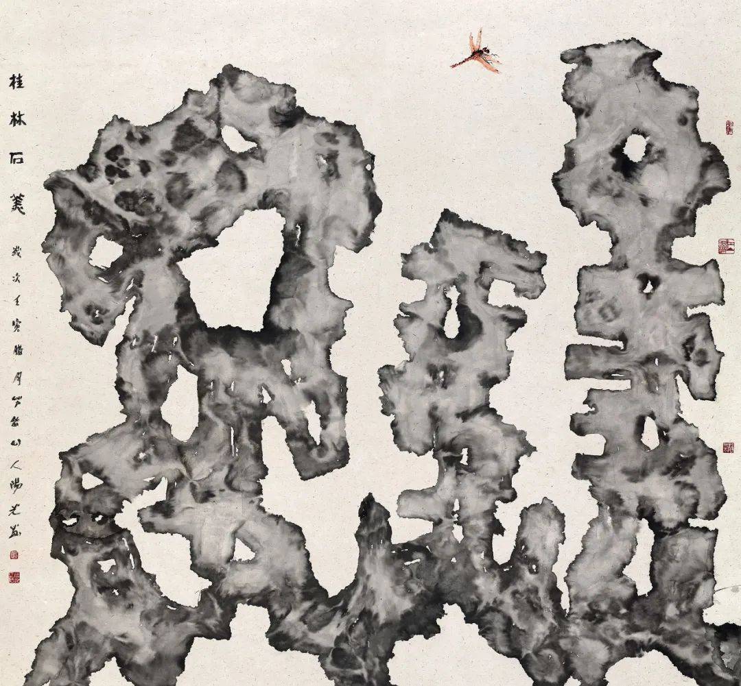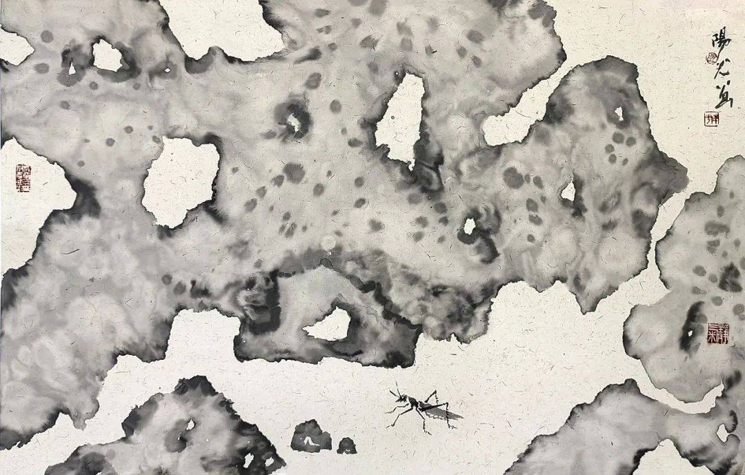 在“漓江探源”主题下,阳光近些年画了一些笔简意赅、尺幅较小的作品,以“桂林洞奇石美”“花非花”“家乡风情”诸系列为题。而他的大画,磅礴大气、饱满郁勃、激情满纸:“漓江山水”系列中的《漓江岚韵》,意象的象鼻山在墨迹的变化交汇中,形成一种网状的抽象水墨语言,与写实、精巧的渔船形成鲜明的对比,营造出新异的审美效果;《漓江之源》则用抽象的墨线构成动态很强的图像来表现“源”的主题,充分凸显了创作意图——在笔墨的桂林山水世界中,阳光致力于“自家造稿”,为观者展现出另一番不同风貌的桂林。