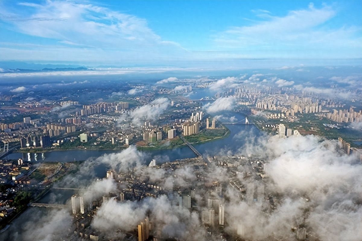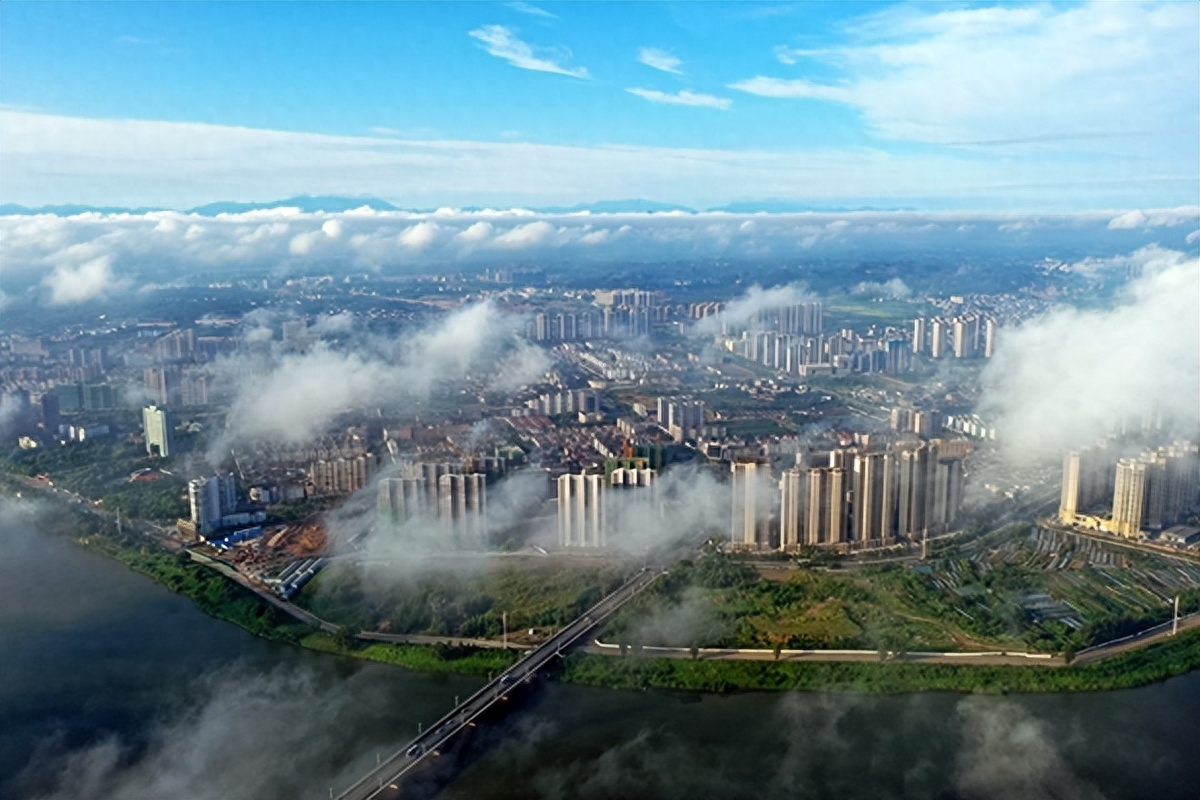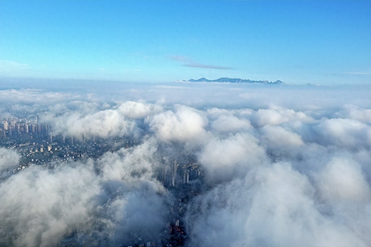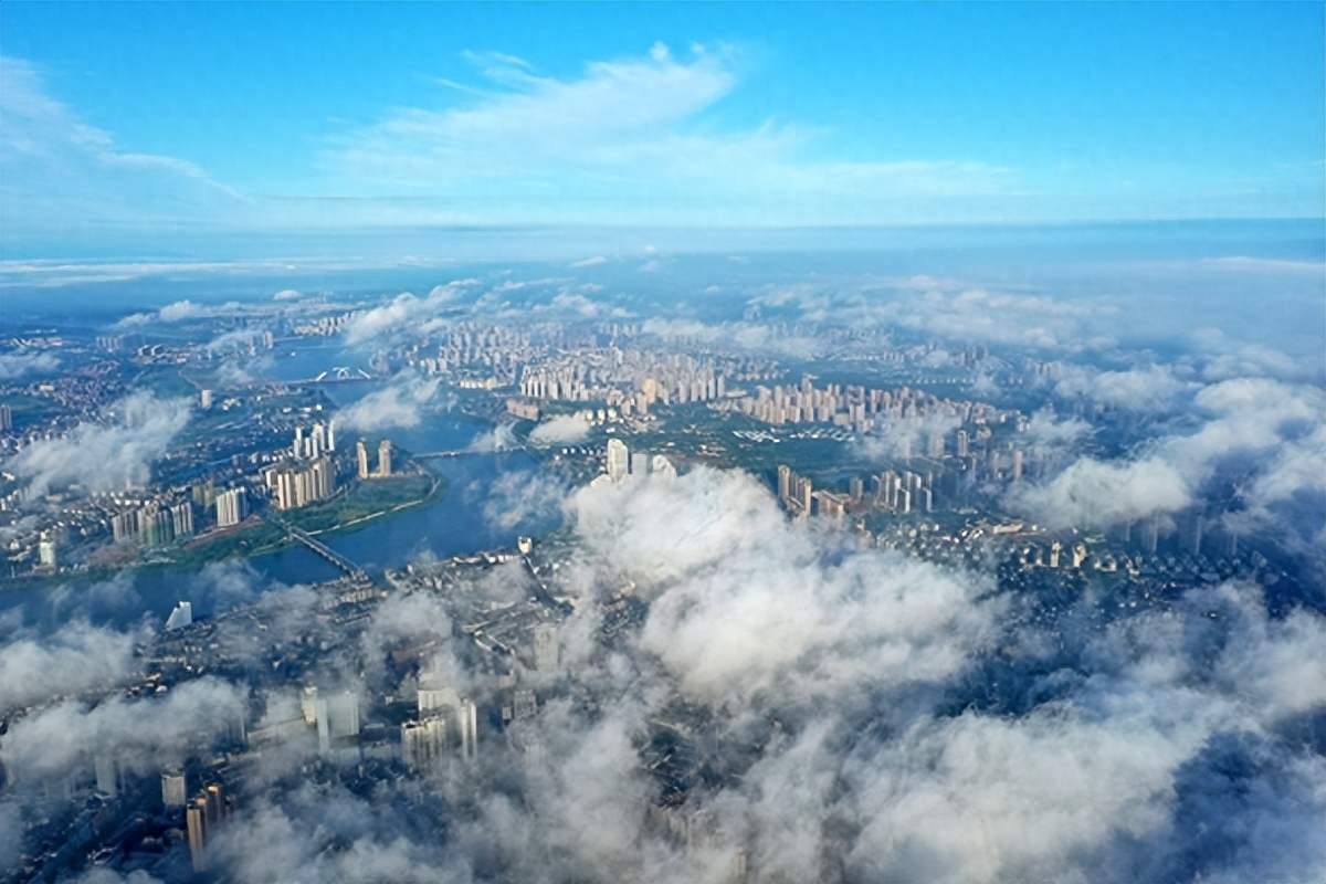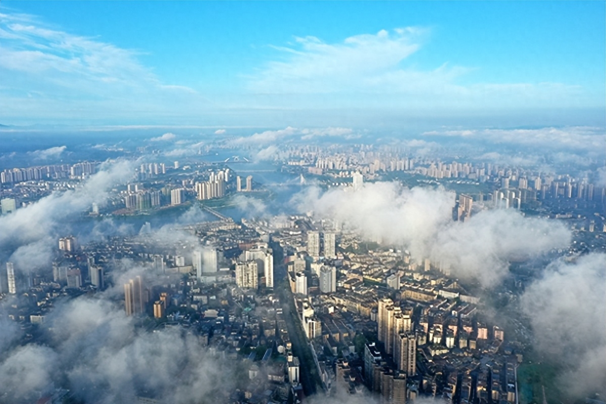 近日,大雨过后江西省上饶市信州区、广信区上空云雾流淌,雾气缭绕,整个城市在云雾的笼罩下一片朦胧,建筑物若隐若现如梦如幻,美妙绝伦,宛若天空之城。(艾世民摄影报道)