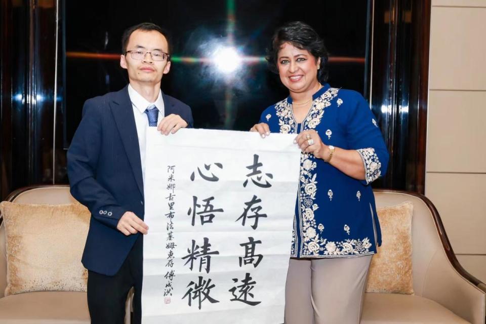 晚宴上,傅成洪与毛里求斯总统进行深入交流,分享了自己对书法艺术的热爱和理解。期间傅成洪说到: “书法是一种深入人心的文化语言,我希望通过我的书法作品,能够在两国人民之间架起一座沟通的桥梁,让友谊之花在艺术的滋养下,愈加绚丽绽放。”