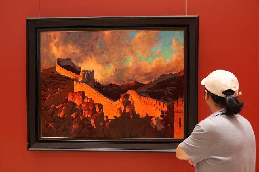 9月19日,观众在欣赏画作《长城》。中国日报记者 姜东 摄
