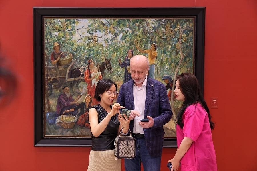 9月19日,观众在画作《葡萄园》前交流。中国日报记者 姜东 摄