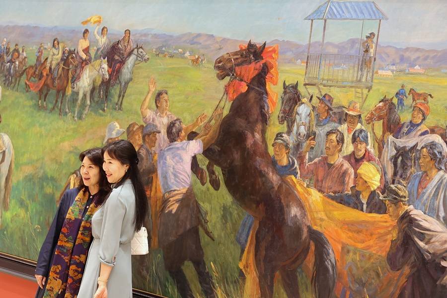 9月19日,观众在画作《欢腾的草原》前拍照。中国日报记者 姜东 摄