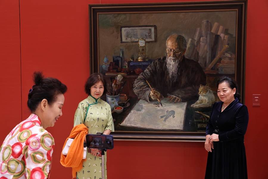 9月19日,观众在画作《白石老人》前拍照留念。中国日报记者 姜东 摄
