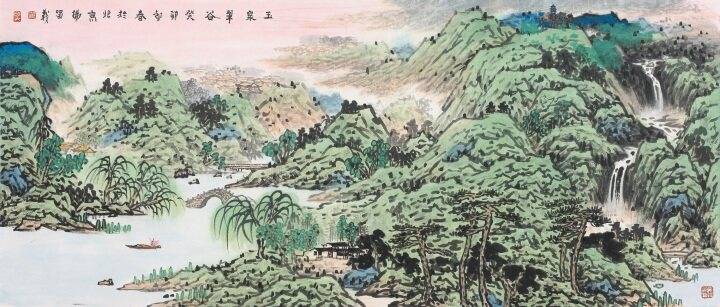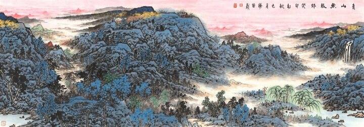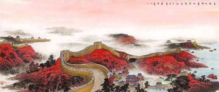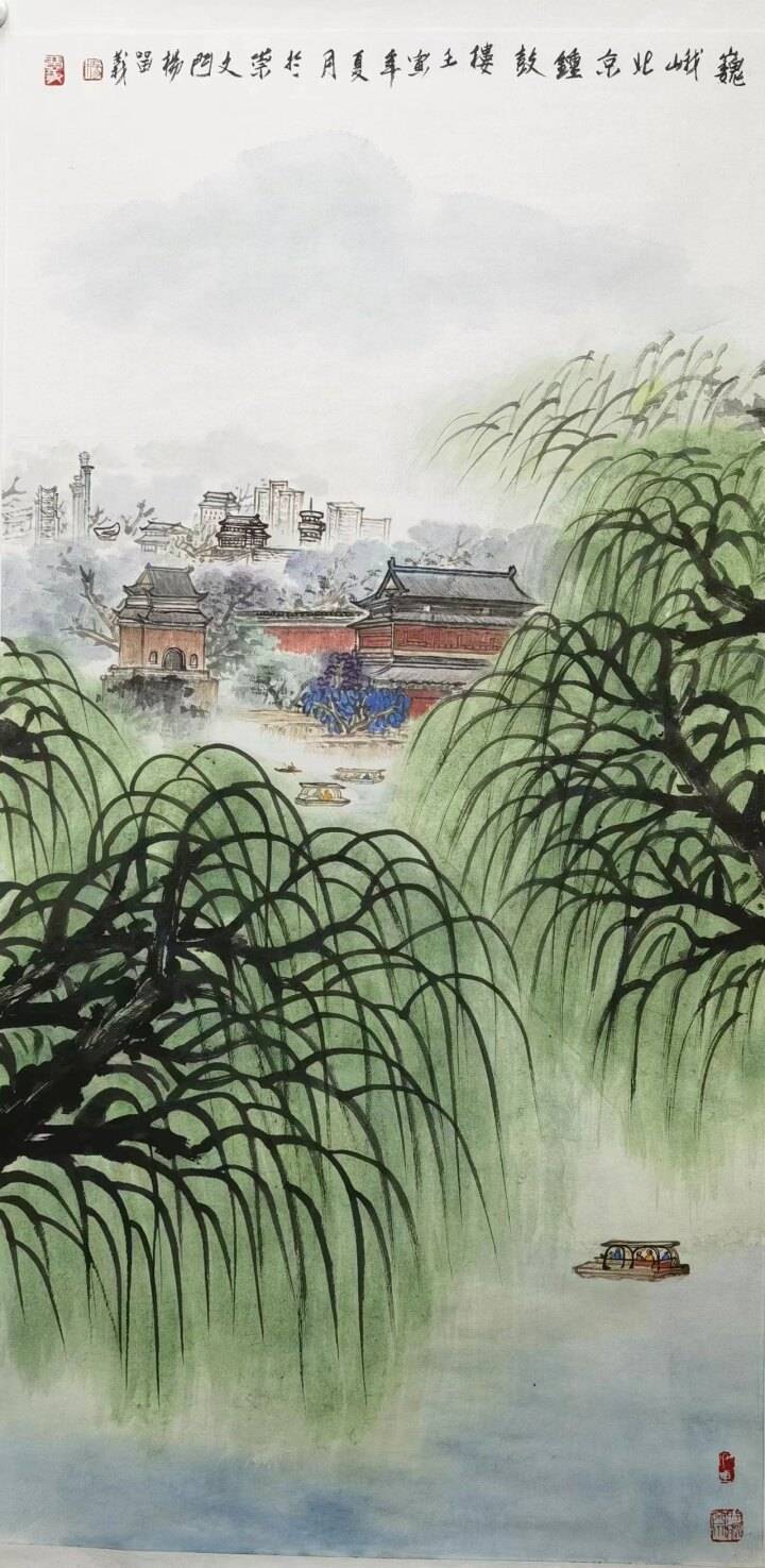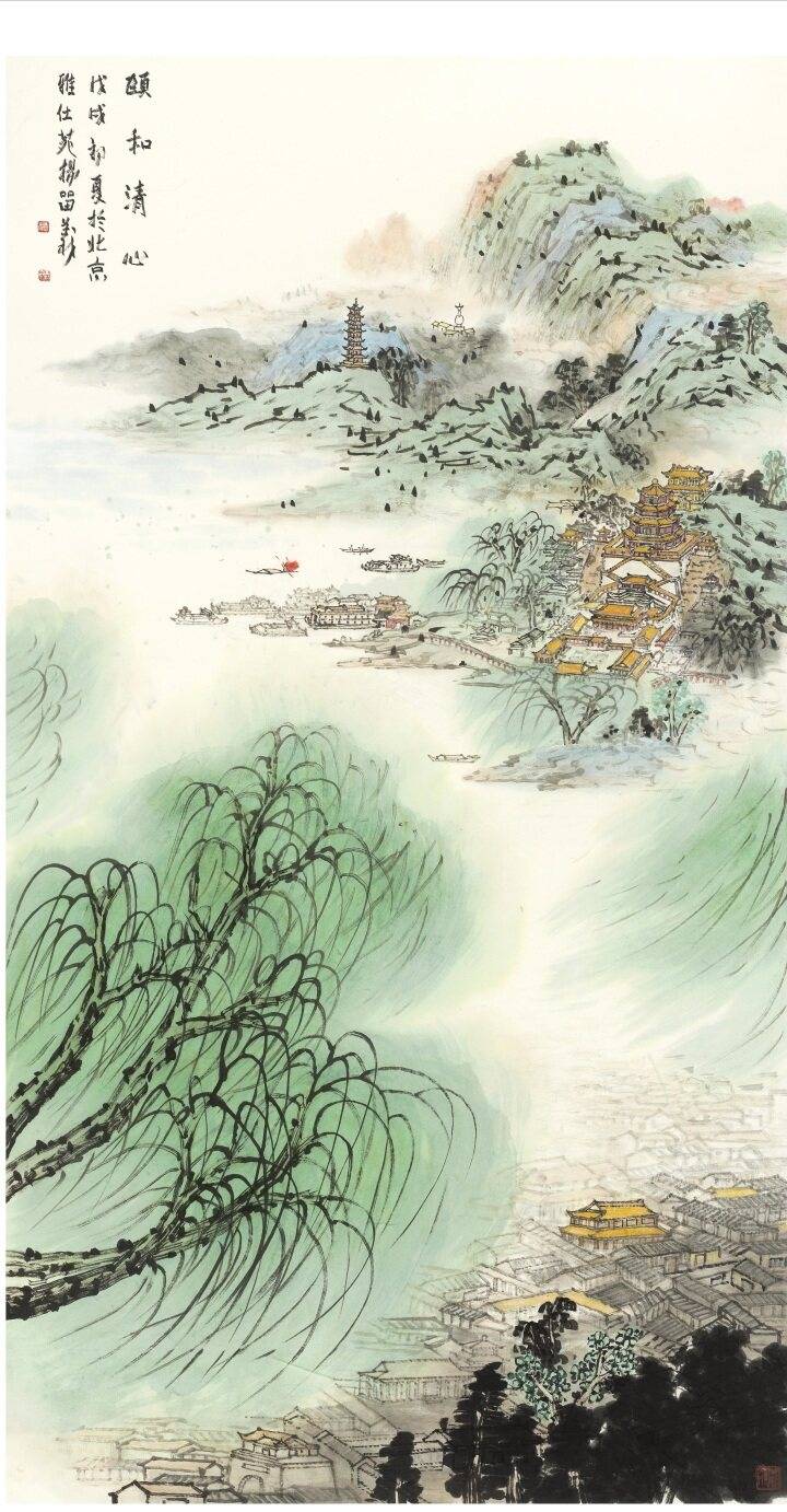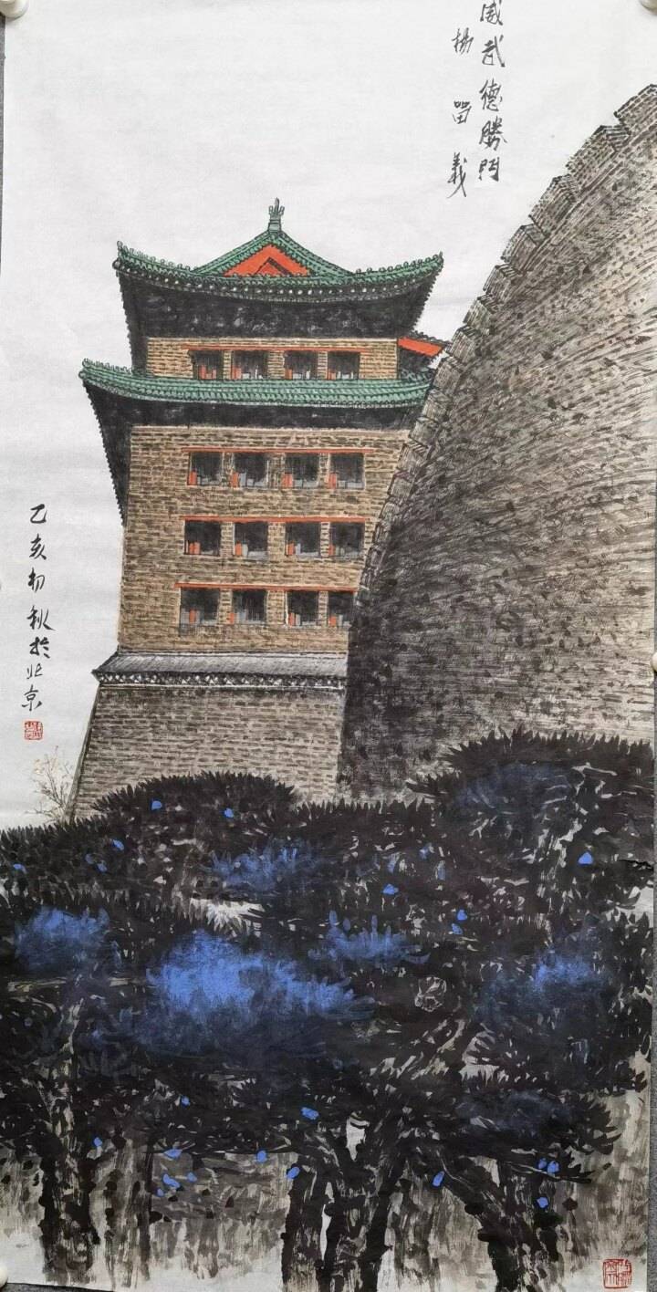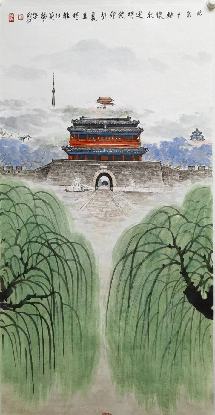 本次展览中,《祖国首都——北京》《金色映京华》等诸多作品以城市山水的艺术形式描绘了北京中轴线上的诸多风景名胜和人文风情——以《北京中轴线永定门》“开篇”,从《天坛之歌》《中华之前门》到《巍峨北京钟鼓楼》《威武德胜门》,从《故宫金秋》的满溢金黄与正红,《登临望颐和》《颐和清心》《皇家御园——北海》《玉泉翠谷》充盈的青山绿水……