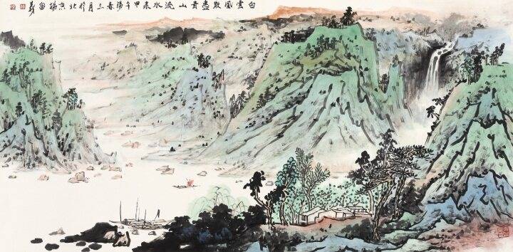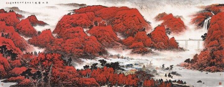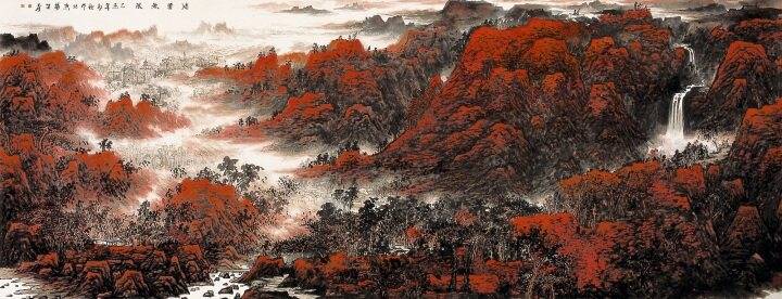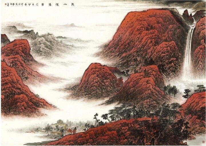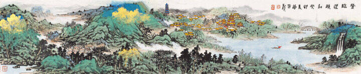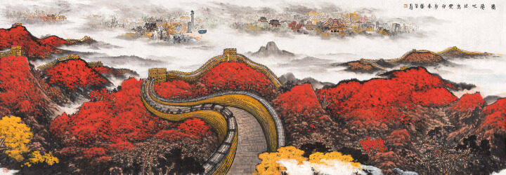 跟随杨留义的创作,观众得以遍览“北京中轴线”的无限风采,同时可以领略中轴线上当代建筑的时代风貌:《奥运之光》聚焦北京新地标;《魅力北京世园会》将城市风情与传统山水笔法相结合,在散点透视的园林景观中,尽显园林全景,展现中国画应有的审美意蕴和艺术价值;特别是《腾飞吧北京》,自万里长城上以平远角度远眺北京城,城内著名地标一一展现,与北京秋日著名的红枫之色互为映照,使笔墨色彩融于一体,在淋漓酣畅之中给人以神采飞扬、意境旷远之感,更显现出其与杨留义城市山水画代表作《长城万里山河红》的一脉相承。杨留义的城市山水画基于北派山水的大构图、大开合、大气势,不为斩刻之形,但求雄浑气象;同时,在细节描绘上,他又深受南派山水的滋养,在作品中着力呈现浓郁华滋、氤氲隽永的意趣。