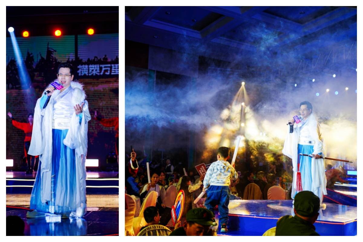 石子义作品涵盖了多种风格,从主旋律歌曲到国风古韵,他都能驾驭得恰到好处,《弹剑而歌》唱尽放浪潇洒、豪放不羁的江湖情,《龙凤吟》美妙的音符和力量的唱腔交织在一起诉说着龙凤齐飞横槊万里的动人故事。两首歌曲巧妙融入中国传统昆曲,回味无穷,观众沉浸在音乐的海洋,感受中华文化的魅力!