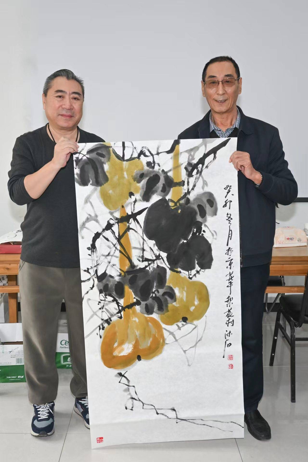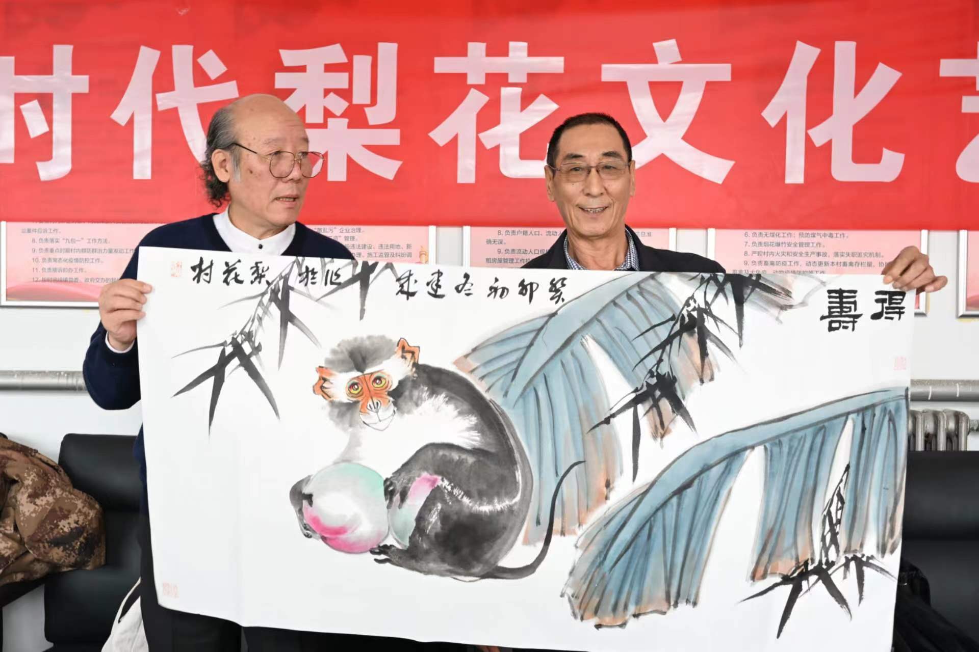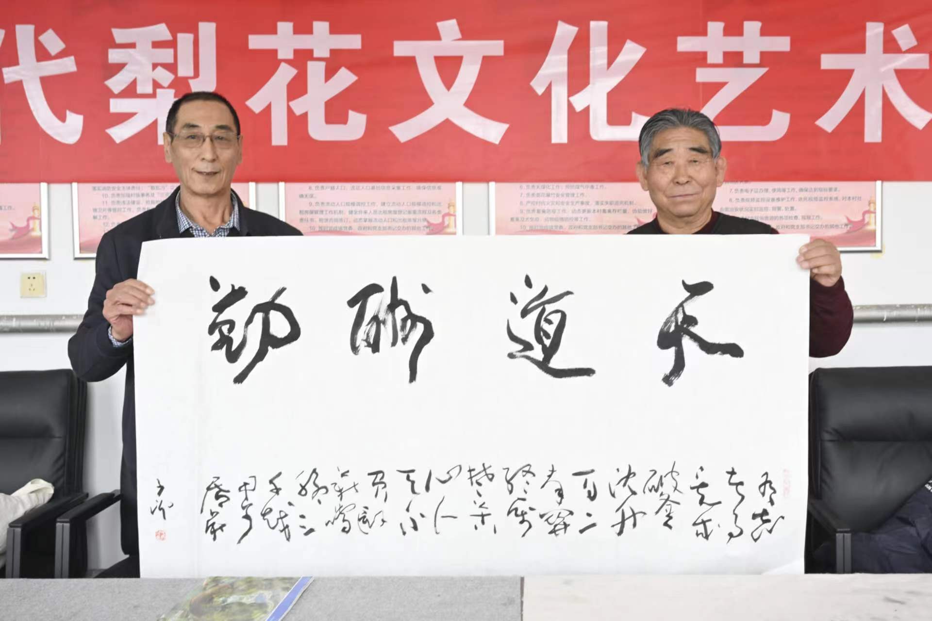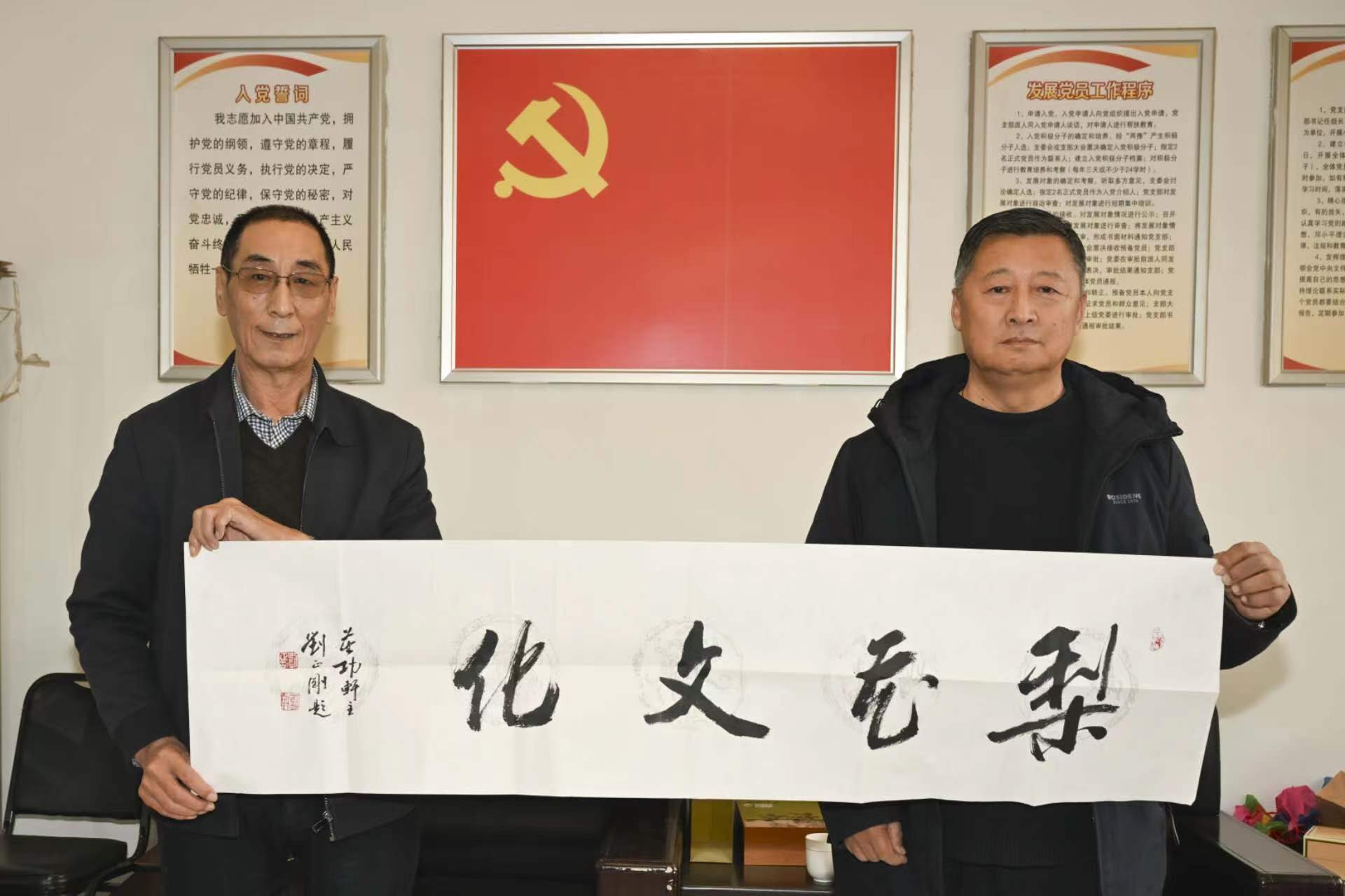 【新时代梨花文化艺术联谊会】外联部主任王春先生(右)代交【新时代梨花文化艺术联谊会】顾问刘正刚先生的题词:“梨花文化”