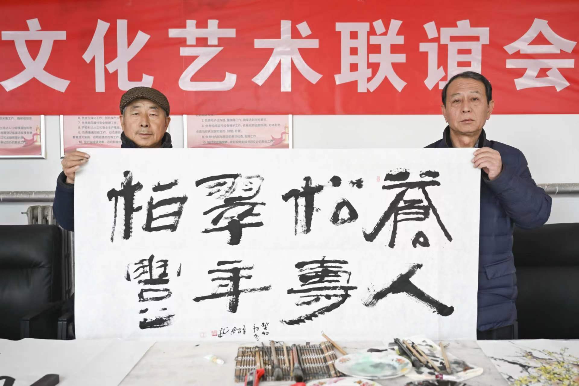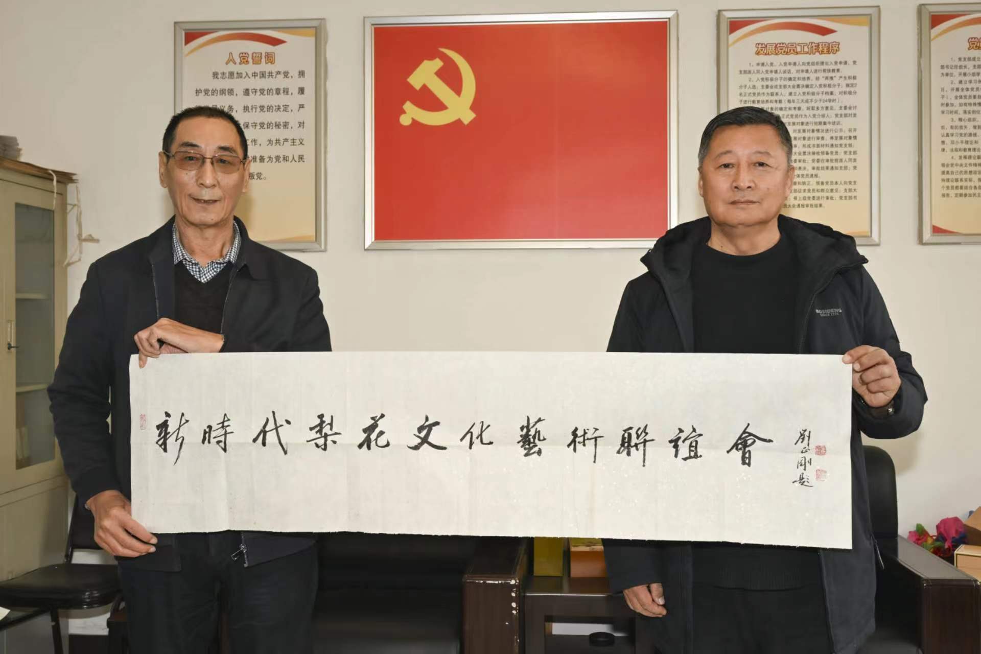 【新时代梨花文化艺术联谊会】外联部主任王春(右)代交【新时代梨花文化艺术联谊会】顾问刘正刚的题词:“新时代梨花文化艺术联谊会”