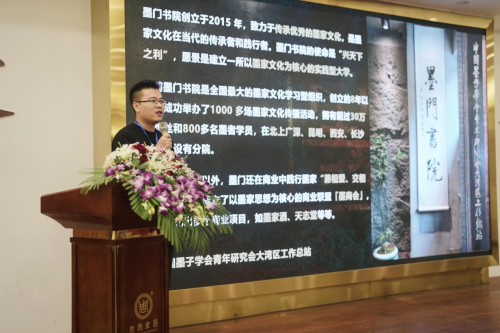 中国墨子学会青年研究会副会长、墨门书院创始人周光磊对墨门书院的整体发展情况向与会的领导和嘉宾作了全面系统的介绍。墨门书院创立于2015 年,致力于传承优秀的墨家文化,是墨家文化在当代的传承者和践行者。墨门书院的使命是“兴天下之利”,愿景是建立一所以墨家文化为核心的实践型大学。作为中国墨子学会青年研究会大湾区工作站的深圳墨门书院,创立8年以来,成功举办了1000 多场墨家文化传播活动,拥有超过30万的粉丝和800多名墨者学员,在北上广深、昆明、西安、长沙等地方设有分院。
