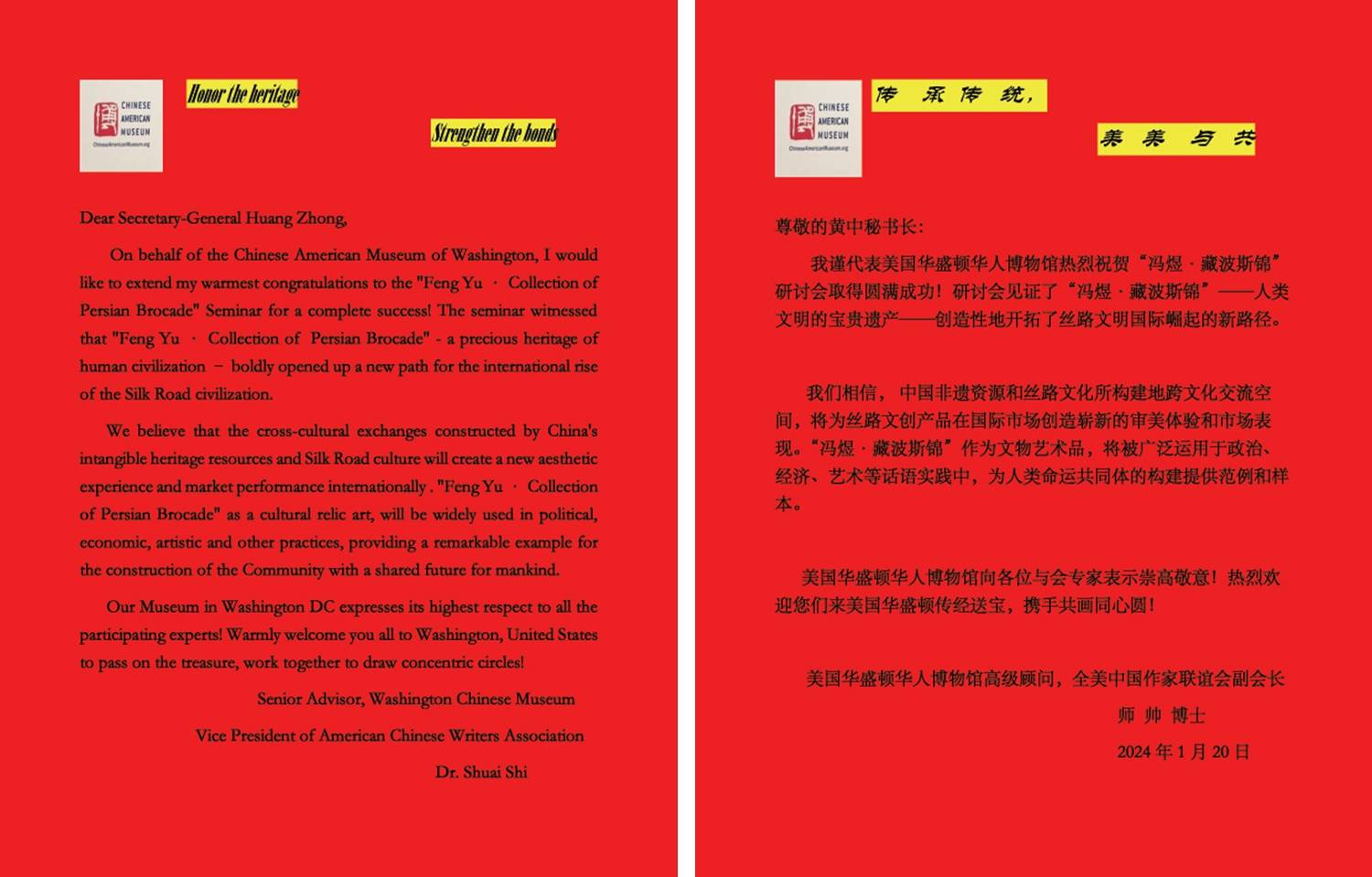 出席“冯煜·藏波斯锦”学术研讨会的领导嘉宾有:张伯驹潘素文化发展基金会会长楼开肇,中国艺术经济研究院院长、博士生导师西沐,北京外国语大学艺术研究院院长、博士生导师宁强,故宫博物院研究员张淑芬,中国文物交流中心国文智联董事长潘剑平,中国保险学会原秘书长许彬,国家对外文化贸易基地常务副总经理赵伟,中国价格协会文物艺术品分会常务副会长李晓坤,中华世纪坛世界艺术中心理事长袁小楼,海南省文物研究会副会长、著名收藏家冯煜,文贸通进出口设计贸易创始人王欣,研讨会由中国非遗资源管理评价委员会副秘书长黄中主持,京华美术学院院长项栋辉在澳门题词“华夏丝魂”致贺,法学博士、全美中国作家联谊会副会长师帅从美国华盛顿发来贺信。海南省古玩行业协会会长、海南省文物研究会副会长马嘉琦作总结发言。
