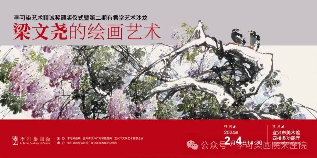 由李可染画院、宜兴市文体广电和旅游局、宜兴市文学艺术界联合会联合主办,李可染画院宋庄院、宜兴市美术馆(书画院)承办的“李可染艺术精诚奖颁奖仪式暨第二期有君堂艺术沙龙-梁文尧的绘画艺术”将于2024年2月4日下午在宜兴市美术馆举行。
