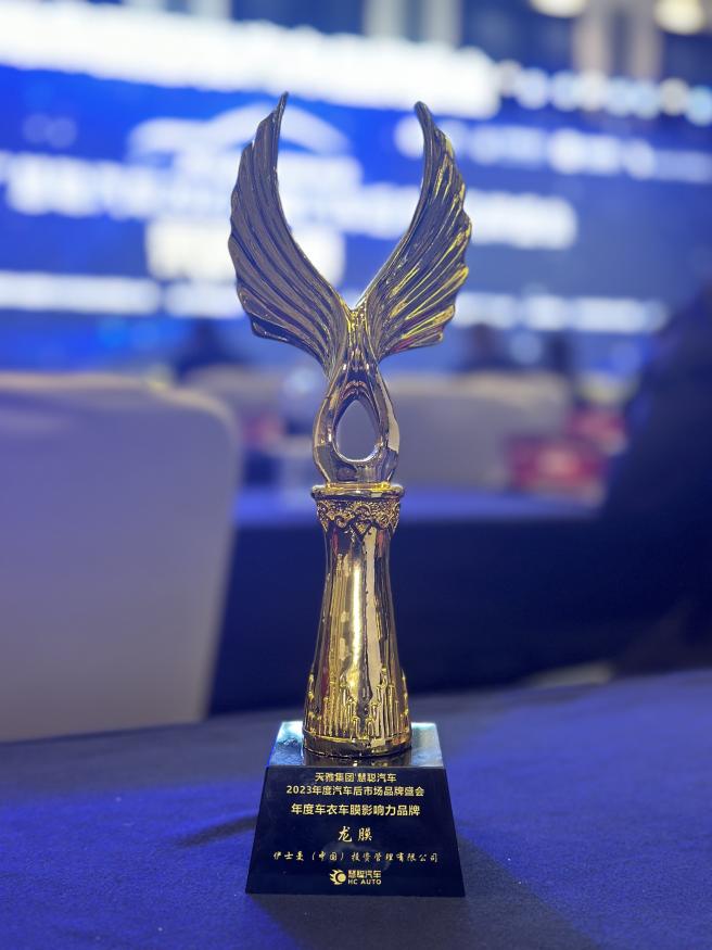 图为龙膜“年度车衣车膜影响力品牌”奖杯