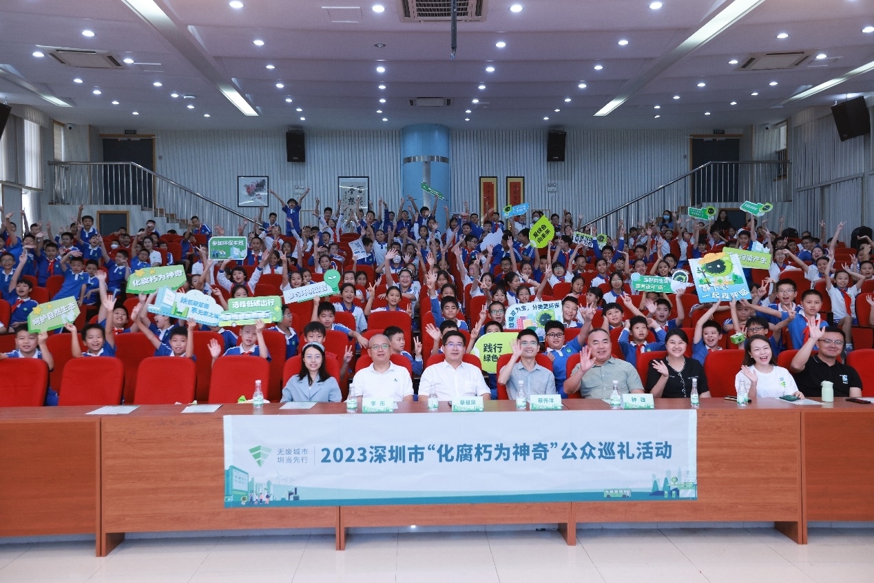 2023年10月13日,深圳市“化腐朽为神奇”公众巡礼进校园活动在深圳市福田区百花小学举行。本次活动以“无废童行,绿色共享”主题,以“无废生活市集+无废科普”的形式开展。活动当天,无废科普讲师为百花小学五年级将近300名学生带来一堂别开生面的“无废科普课堂”,引导学生践行绿色生活方式,共享深圳“无废城市”建设成果。