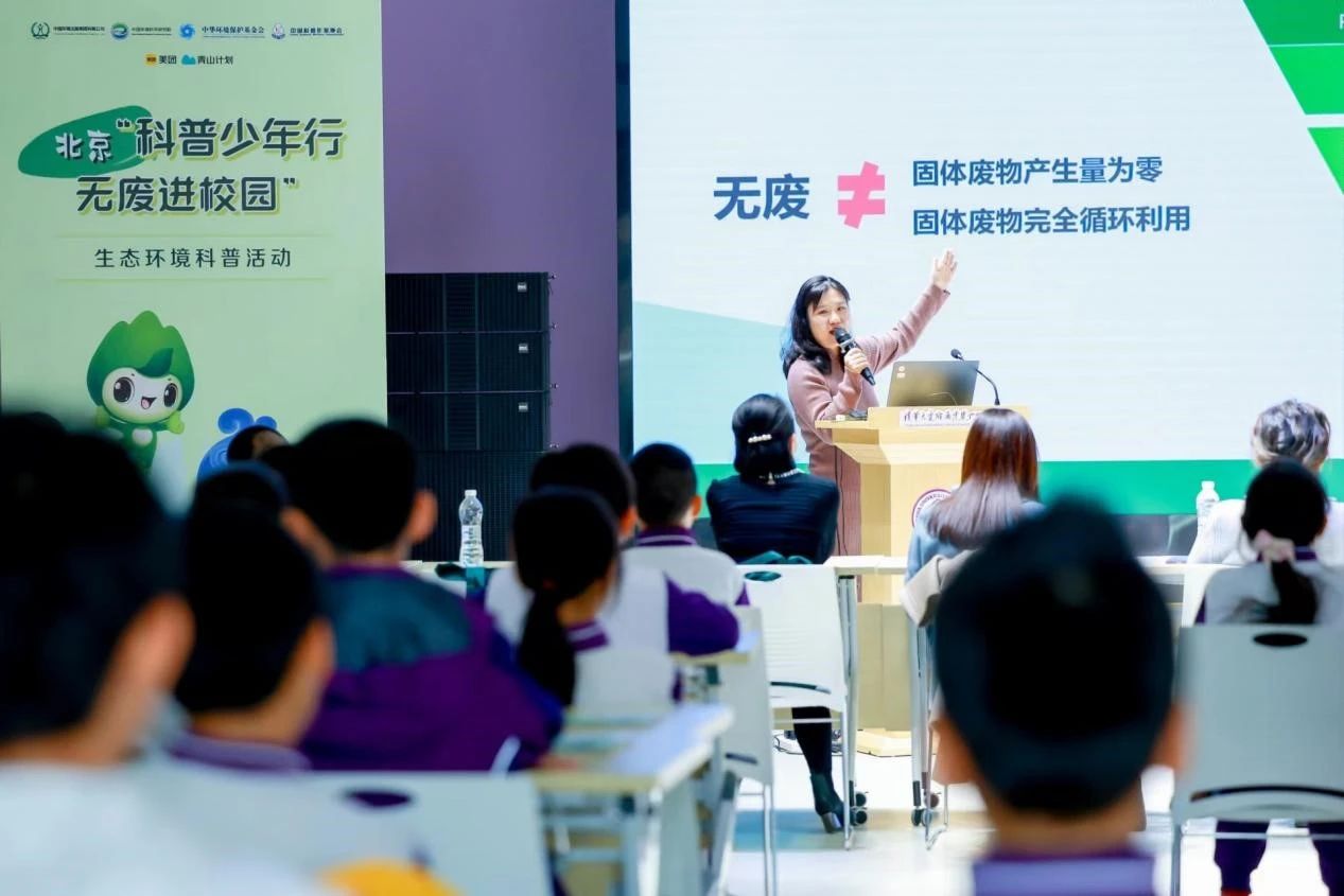2023年11月24日,北京“科普少年行-无废进校园”生态环境科普活动成功在清华大学附属中学广华学校举办。“‘无废城市’建设需久久为功,需全社会参与,需要每个人的共同努力。”生态环境部固体废物与化学品司固体处副处长聂志强在致辞中说道。随后北京市环境保护科学研究院固废所所长、副研究员张文毓在科普课程中带来关于北京市无废城市建设实践案例的精彩讲解,在有趣的动手实验互动后,同学们更加深刻地认识到减少废弃物产生的重要性,大家齐声说着:“让我们一起共建无废城市、共建美丽中国!”