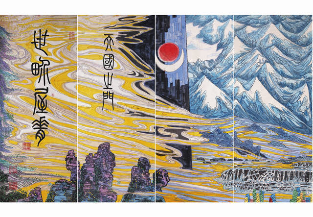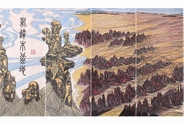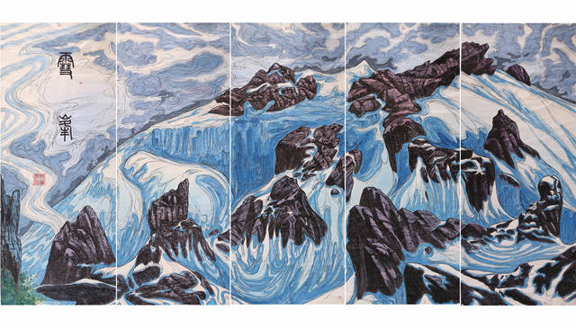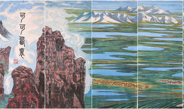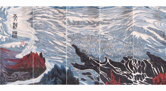 这里有世界屋脊的“屋脊”一一阿里高原,这段只是《中华江山图》的160分之一的篇幅,但是这里离天最近,雪峰林立,百川奔突于万仞丛中,世界上最壮观、最雄伟的喜玛拉雅、冈底斯、昆仑、喀喇昆仑等山脉交错横亘在这里。
