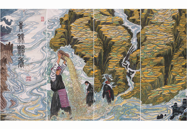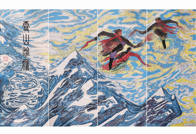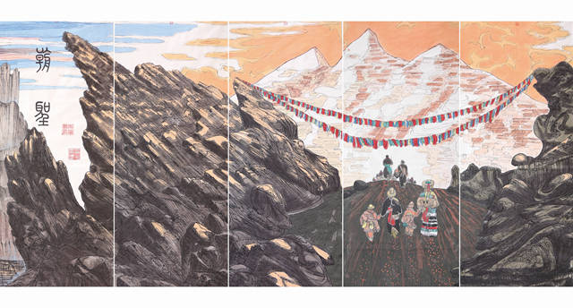 世界屋脊由青藏高原、喜马拉雅山、可可西里、柴达木盆地等三十六个小段组成,总长四百余米。这一大段的核心是雪域高原西藏,唐宋时期的吐蕃到西藏自治区的成立经历了从农奴制到民主改革的脱胎换骨。我们沿着《中华江山图》每走一步我们都能看到雄伟壮观、神奇瑰丽的自然风光。这里是离天最近的地方,这里的人们在雪域之巅与天对话,画面中少不了朝圣者,他们为了极乐的明天不怕高原风雪,山高路远,以赤诚的心踏上黄金般的朝圣之路。
