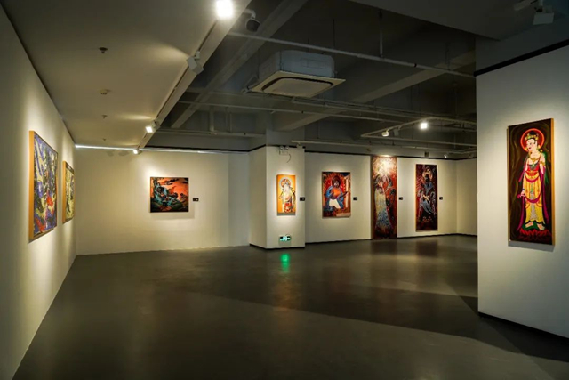 本次展览展出北京外国语大学艺术研究院院长,硕士、博士研究生导师;教育部长江学者;北京靳尚谊艺术基金会学术顾问宁强教授近期创作53幅大尺幅布面油画以及丙烯绢本作品。作为敦煌学新禅画派的创立人,宁强教授以独特的色彩组合、新颖的用笔形式打破了中西方艺术的边界线。其作品既展现了早期石窟壁画和雕塑的轮廓分明、线条简练之特点,又巧妙处理了人物、动物比例,创造出卡通般的面孔。