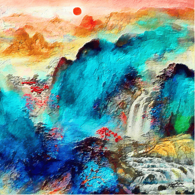 《江山多娇》的创作者是光影平面油画创始人于江先生,他以独特的视角和细腻的笔触,将祖国的大好河山表现得淋漓尽致。光影平面油画作品中,红日、云霞、山川、河流、树木、房屋等元素都被巧妙地融合在一起,形成了一幅壮美的画卷。画面的色彩丰富而和谐,光影的运用使得画面更具立体感,给人以强烈的视觉冲击。