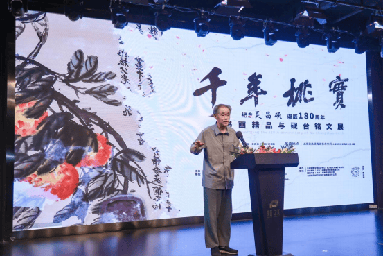 吴昌硕为“清末海派四大家”之一, 集“诗、书、画、印”为一 身, 融金石书画为一炉, 被誉为“石鼓篆书第一人”、“文人画最后的高峰”。在绘画、书法、篆刻上都是旗帜性人物, 在诗文、金石等 方面均有很高的造诣。此次展览虽然作品只有 100 余幅,但却很精, 很具代表性。从题材上讲, 既有花卉, 也有山水、人物、还有砚拓铭文; 从材质上讲, 既有纸本的, 也有泥金绢本的, 还有绫本的;从创作 主体上讲, 既有独立完成的, 也有合作完成的;从来源上讲, 既有私人 珍藏的, 也有机构收藏的, 可谓是展览虽小, 内涵却大, 场地虽简, 品味却高。“千年桃实大如斗”, 吴昌硕是属于中国的, 也是属于世 界的, 更是属于人类共同精神家园 的 …… “丹光碧叶寿万春”, 吴昌 硕是属于昨天的, 也是属于今天的,更是属于明天的 ......“年年看花 (画)人,颜色如花(画)好”,这是吴昌硕的诗,也是吴昌硕对我们今天的“看花 (画)人”的真诚祝福。