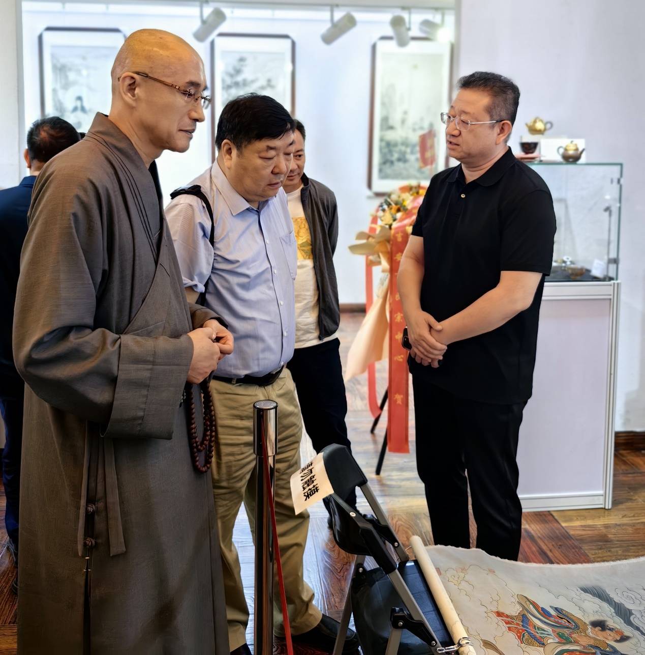 雅集现场中藏协刘理事长与李海峰、仁悟法师观赏佛画和茶器