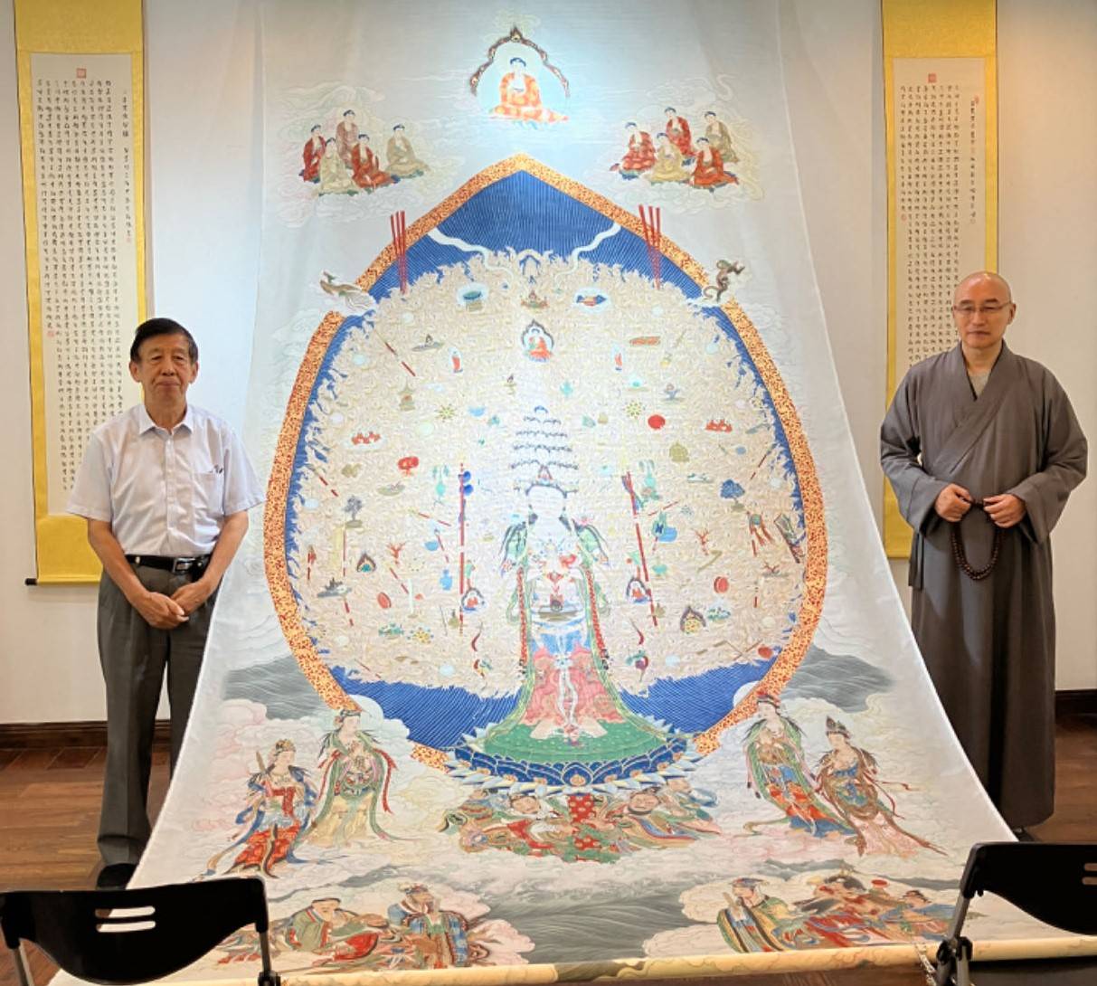 随后法师以主展人身份与主礼嘉宾们共同宣布展览开幕,并与是次展览的檀越善信肖卫平、欧阳钦诸君陪同陈会长等贵宾入馆玄览佛画精绘宝卷,各方人士驻足于仁悟法师历时两年创作长达五米的千手千眼观音绢本巨帙前,无不由衷赞叹,纷纷合影留念,共感法喜。
