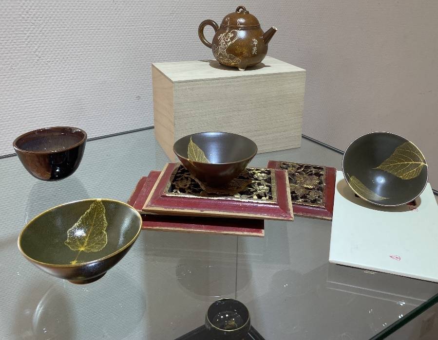 江西吉州窑木叶盏非遗技艺传承人曹锟先生为到场人士解读了千年木叶茶器的流变与演进,其尝试创烧的木叶天书品种,纹样清晰,线条洗练,錾刻精雅,色泽肃穆,格调古朴,堪为当代茶器大珍,实乃不可多得的茗具逸品,来宾为之激赏,获致嘉誉!同时曹老师诠释了禅茶一味的真谛,并现场演示了叶浮于水的幻化玄妙意趣,观者无不啧啧称奇,大饱眼福!