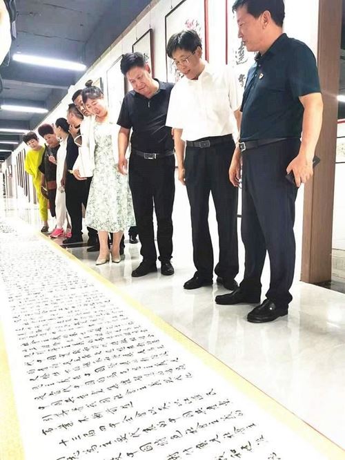 活动现场,领导嘉宾共同参观了刘啸泉老师创作的百米长卷党章书法作品。正如刘啸泉所说,作为一名党员和书法爱好者,党章书写的过程也是一个再学习的过程,达到又一次深刻的认识和升华。书写当中,大标题采用篆体,二标题用隶属,内容用行楷,后记用正楷,自始至终体现了对党章的敬重和严肃的政治态度,用这种方法和形式,给党的生日献上一份厚礼。