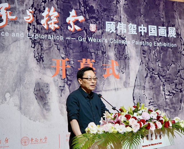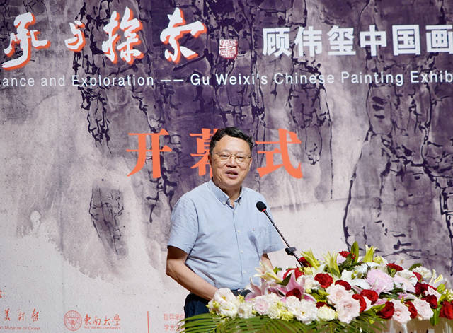 东南大学党委书记左惟首先致辞,他说:“我代表东南大学,对各位的光临,表示热烈的欢迎和衷心的感谢!顾伟玺是我校的资深教授,是推动东大艺术学科建设与发展的重要学者和专家,也是我校艺术创作研究的领军人物和学术带头人。多年来,顾教授始终坚持理论与实践并重,始终坚持在教学和科研的第一线,利用中国画研究院的学术平台,为东南大学艺术人文学科的发展,做出了重要贡献。”