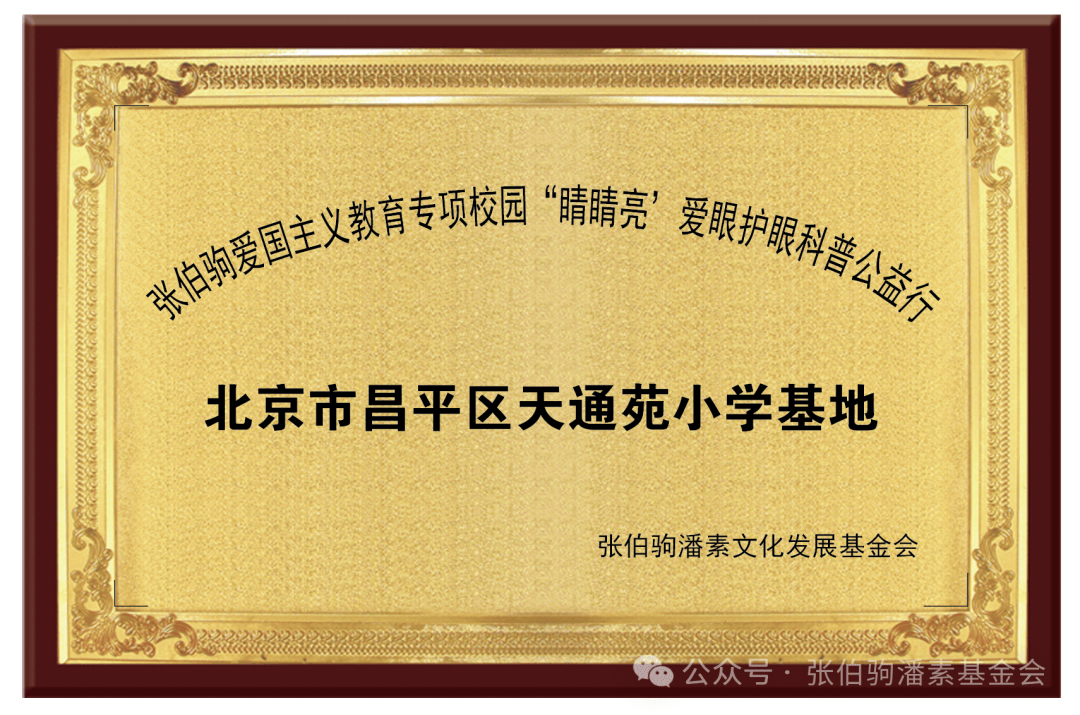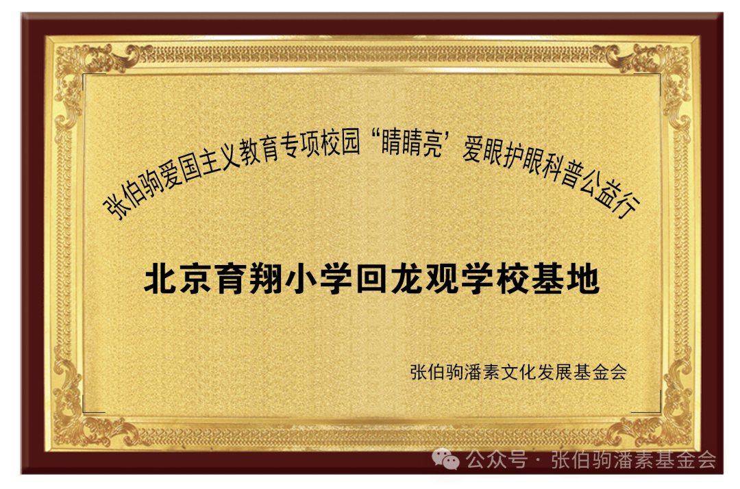 基金会此次捐赠北京育翔小学回龙观学校、北京市昌平区天通苑小学“青少年近视护眼罩”共计500件,总价值人民币:捌拾柒万元(小写:870000元),通过这次捐赠活动的实施,这两所学校已分别获得张伯驹潘素文化发展基金会张伯驹爱国主义教育专项校园“睛睛亮”爱眼护眼科普公益活动宣导基地的资助授牌。