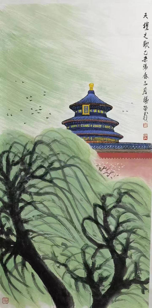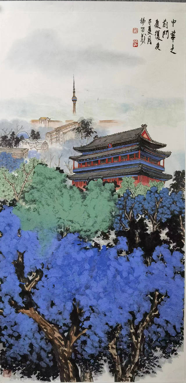 在创作中,杨留义将“北京中轴线”上的独特自然风物与城市特色景观相结合,兼具建筑的精准透视与传统山水画的笔墨肆意,并将地域色彩浓厚的城市风貌与自身特有的笔墨语言形式融会贯通。在他看来,“北京中轴线”是一条有多层文化意蕴的文化系统,在创作中,理应将其置于庞大的时空关系中予以考察;他将自己的创作视为一辆“时空列车”,不停穿梭在中轴线上,从而探寻到深厚历史与现实时空的“共通点”,致力于展现“北京中轴线”的艺术魅力,并呈现出城市山水画创作蓬勃的生命力。