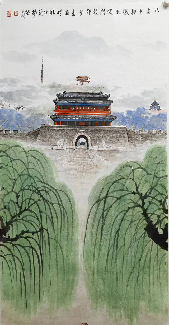 在“北京中轴线——中国理想都城秩序的杰作”成功列入《世界遗产名录》的喜讯传来之际,北京城市山水画研究会会长、著名画家杨留义特地举办了以北京中轴线暨京城胜景为主题的城市山水画作品展。本次展览由中国乡土艺术协会、北京城市山水画研究会主办,7月28日在北京攀天红文创园隆重开幕,以北京中轴线及其周围风景名胜为主要内容创作的100余幅城市山水画精品,吸引了众多艺术爱好者和文化遗产保护者的关注。