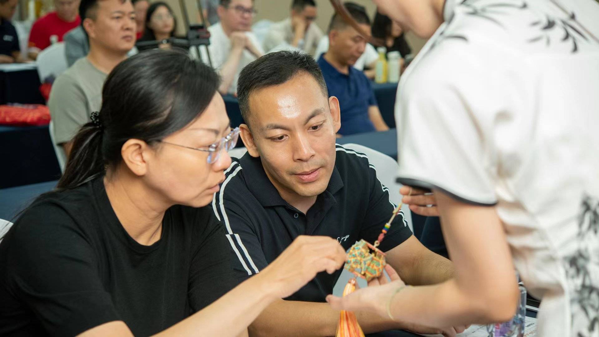 决赛之日,星光熠熠。专业评委团以专业的判断,严谨的态度,从技艺、创意、文化传承等多维度对作品进行评判。结绳组与黄金转运珠组佳作频出。特别是作品《开运鸮珠》,以圆形转运珠象征幸福与圆满,以鸮珠代表胜利与财运,将吉祥寓意融入精美的造型之中,展现出深厚的文化底蕴和独特的艺术魅力,最终获得了评委们的高度赞赏。另外作品《灵猫纳财》与《吉骰》同样出彩且吸睛,前者以灵猫的灵动姿态寓意招财进宝,将传统文化中对灵猫的吉祥寓意与现代审美巧妙融合;后者以骰子的随机性象征着好运降临,将传统文化中对吉利数字的期许融入作品设计,皆体现出创作者对传统结绳艺术的深刻理解及对美好生活的期许,展现出当代手工艺传承者旨在传统文化与现代艺术之间构建起一座桥梁,将传统文化的精髓融入当代艺术创作,赋予作品更深层的文化内涵。现场评选照片