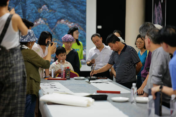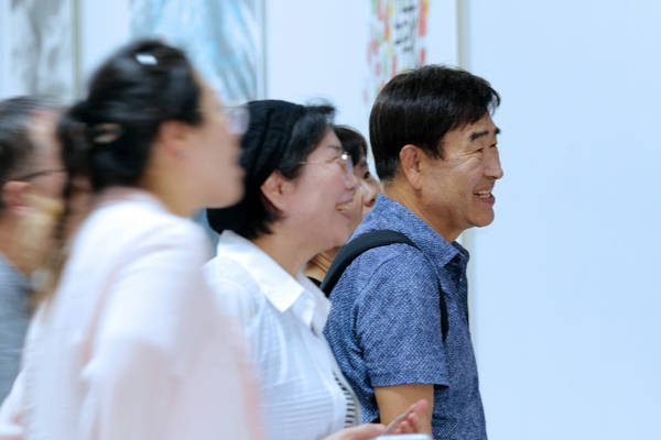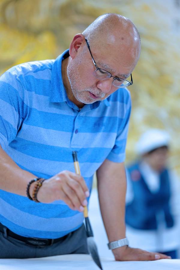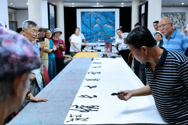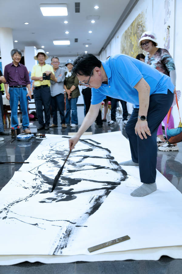 笔会现场,韩国书画艺术代表团团长李荣根先生以雄浑遒劲、风神高迈的巨幅书法“祝贺昆仑山人金京模艺术大师一一中华江山图创作圆满成功”赢得了阵阵喝彩。赵敬心、崔炯柱、赵恩惠、郑在炅等艺术家先后按交流笔会创作主题泼墨挥毫,一幅幅或雄浑壮美的山水,或清新自然的花鸟画跃然纸上,让人们仿佛置身于山川自然之间的仙境。而在场的中国艺术家们也被李荣根团长及艺术家们的才华所折服,纷纷表示受益匪浅。