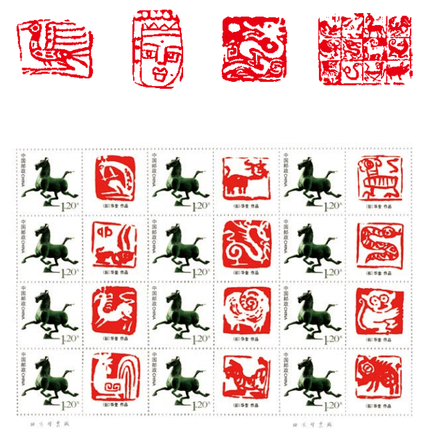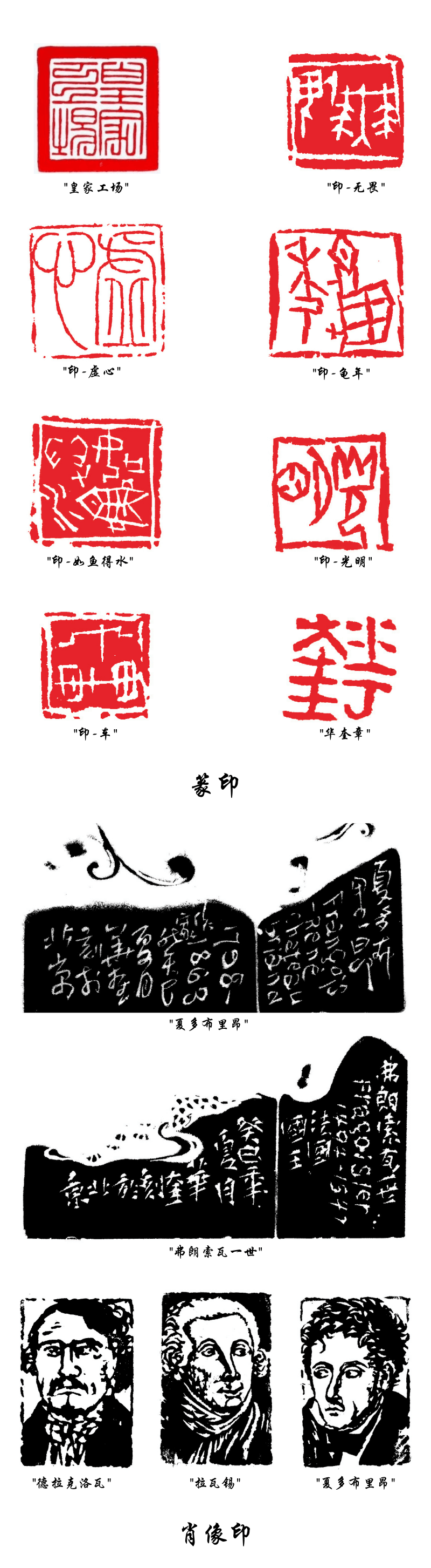 华奎自幼沉浸印学,篆印、肖形印、肖像印皆成气候。篆印,以大篆、小篆、甲骨文入印,意韵各各不同,但都不失金石之趣;肖形印、肖像印以画入印,特别注重形神兼备,却皆印味十足。