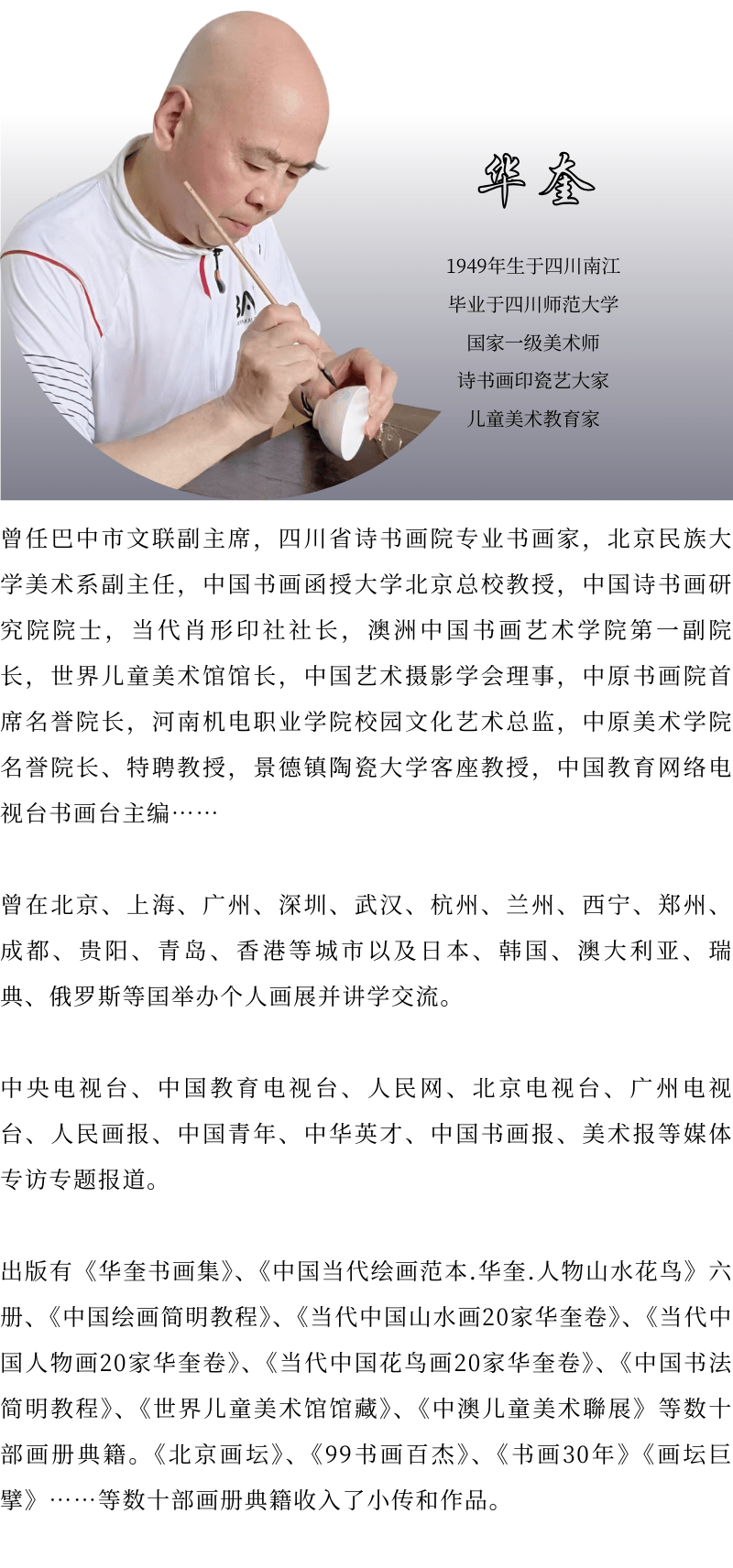 华奎,聪颖勤勉,自幼酷爱书画篆刻艺术,数十年孜孜以求,德艺双馨。其作品题材广泛,形式多样,风格鲜明,既有深厚的传统功底,又有强烈的现代意识,无论人物、山水、花鸟都有突破性建树,深受中外人士青睐。华奎不仅是位实力派书画篆刻家,同时也是一位成绩卓著的儿童美术教育家,今年来又在公益慈善事业和向世界推介中国书画艺术事业方面贡献着自己的力量。风格即人、作品说话,读懂作品,便可读懂其人。