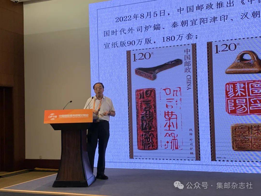 中国书法家协会理事、中国美术家协会理事、西泠印社理事容铁先生,演讲的题目是国家名片助力篆刻艺术传播。容先生不仅仅介绍了篆刻艺术的传承与发展,更是通过其设计的两套篆刻邮票介绍了邮票对于篆刻艺术的传播作用。