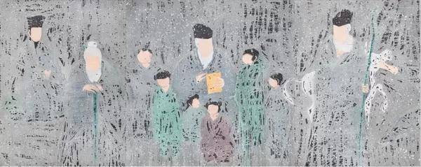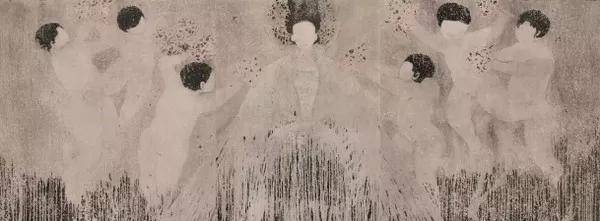 从东方美学平面化的点线面逸性游走的方式,到几何性状或近于混沌的冷灰、暖色、黑、褐中性色块的相互融合、碰撞、渗透,形成厚厚、微妙的色层。矿物颜色多层的叠加之下颗粒的质感反射出历经沧桑岁月洗礼的厚重、坚实、浑然若远古的回响附着于画布。相互对比交互形成的关系、情绪。在《和平》、《七子》等等作品形成历史与当下的对话关系,展开东西对话,过去与现代的对话,色彩稳重、内敛、含蓄的灰重底色托起祥和的图像,或具象或抽象的人物符号影影绰绰,《和平》中间似乎流淌的是泪水、鲜血,抑或是希望之泉的象征,被由内而外的光线投射出来,获得超越历史、地域、民族的崇高与精神本质的追求。