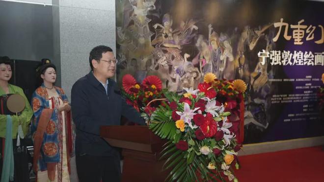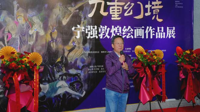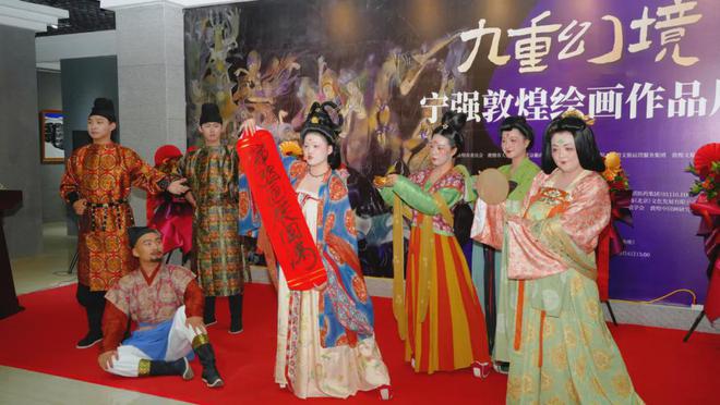 为庆祝中华人民共和国成立75周年,2024年10月6日下午,“九重幻境--宁强敦煌绘画作品展”在敦煌大唐美术馆开幕。展览由敦煌市委、敦煌市人民政府、北京靳尚谊艺术基金会、李可染画院、甘肃文旅运营服务集团、敦煌文旅集团主办,敦煌丝路之美书画院、敦煌大唐美术馆承办,北京靳尚谊艺术基金会秘书长陈潇潇担任策展人。